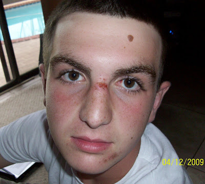 No, really…he wasn’t in a fight, he fell Thursday morning, had a mild concussion, and scared the living daylights out of his mama!